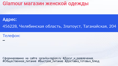 Glamour, магазин женской одежды по адресу 456228, Челябинская область, Златоуст, Таганайская, 204 в дальнейшем Организация, размещена в следующих категориях: