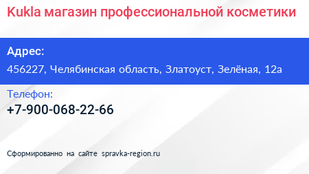 Kukla, магазин профессиональной косметики по адресу 456227, Челябинская область, Златоуст, Зелёная, 12а в дальнейшем Организация, размещена в следующих категориях: