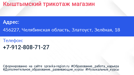 Кыштымский трикотаж, магазин по адресу 456227, Челябинская область, Златоуст, Зелёная, 18 в дальнейшем Организация, размещена в следующих категориях: