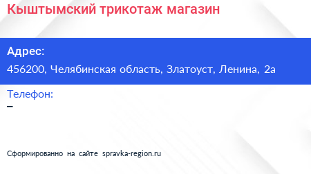 Кыштымский трикотаж, магазин по адресу 456200, Челябинская область, Златоуст, Ленина, 2а в дальнейшем Организация, размещена в следующих категориях: