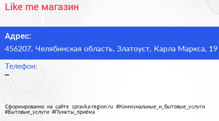Like me, магазин по адресу 456207, Челябинская область, Златоуст, Карла Маркса, 19 в дальнейшем Организация, размещена в следующих категориях:
