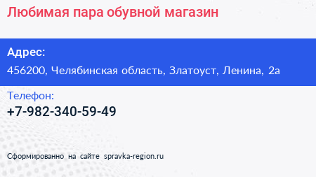 Любимая пара, обувной магазин по адресу 456200, Челябинская область, Златоуст, Ленина, 2а в дальнейшем Организация, размещена в следующих категориях: