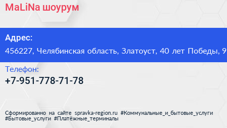 MaLiNa, шоурум по адресу 456227, Челябинская область, Златоуст, 40 лет Победы, 9 в дальнейшем Организация, размещена в следующих категориях: