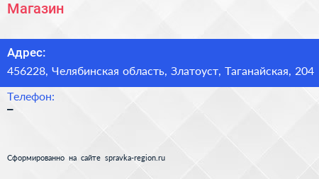 Магазин по адресу 456228, Челябинская область, Златоуст, Таганайская, 204 в дальнейшем Организация, размещена в следующих категориях: