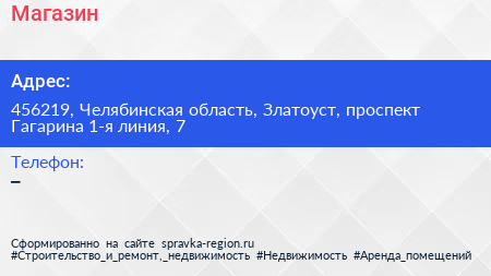 Магазин по адресу 456219, Челябинская область, Златоуст, проспект Гагарина 1-я линия, 7 в дальнейшем Организация, размещена в следующих категориях: