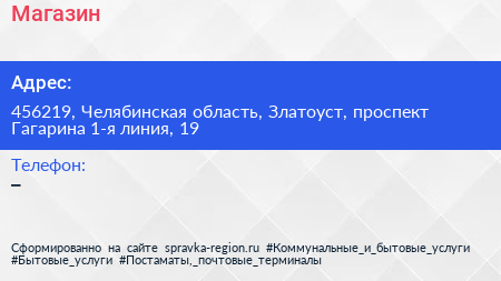 Магазин по адресу 456219, Челябинская область, Златоуст, проспект Гагарина 1-я линия, 19 в дальнейшем Организация, размещена в следующих категориях: