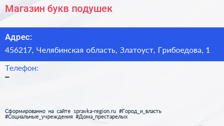 Магазин букв-подушек по адресу 456217, Челябинская область, Златоуст, Грибоедова, 1 в дальнейшем Организация, размещена в следующих категориях: