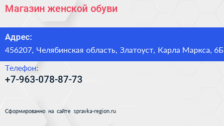 Магазин женской обуви по адресу 456207, Челябинская область, Златоуст, Карла Маркса, 6Б в дальнейшем Организация, размещена в следующих категориях: