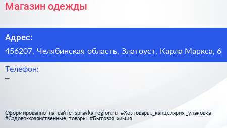 Магазин одежды по адресу 456207, Челябинская область, Златоуст, Карла Маркса, 6 в дальнейшем Организация, размещена в следующих категориях: