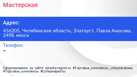 Мастерская по адресу 456205, Челябинская область, Златоуст, Павла Аносова, 249Б киоск в дальнейшем Организация, размещена в следующих категориях: