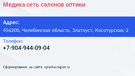 Медика, сеть салонов оптики по адресу 456200, Челябинская область, Златоуст, Косотурская, 2 в дальнейшем Организация, размещена в следующих категориях: