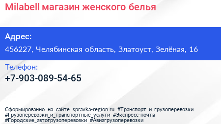 Milabell, магазин женского белья по адресу 456227, Челябинская область, Златоуст, Зелёная, 16 в дальнейшем Организация, размещена в следующих категориях: