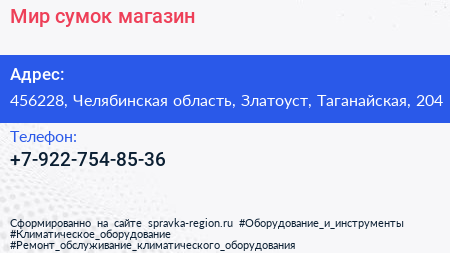 Мир сумок, магазин по адресу 456228, Челябинская область, Златоуст, Таганайская, 204 в дальнейшем Организация, размещена в следующих категориях: