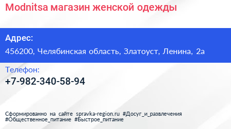 Modnitsa, магазин женской одежды по адресу 456200, Челябинская область, Златоуст, Ленина, 2а в дальнейшем Организация, размещена в следующих категориях:
