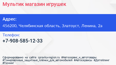 Мультик, магазин игрушек по адресу 456200, Челябинская область, Златоуст, Ленина, 2а в дальнейшем Организация, размещена в следующих категориях: