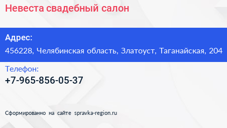 Невеста, свадебный салон по адресу 456228, Челябинская область, Златоуст, Таганайская, 204 в дальнейшем Организация, размещена в следующих категориях: