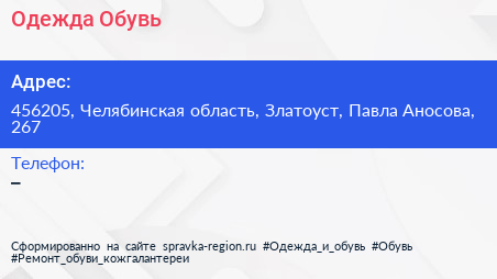 Одежда & Обувь по адресу 456205, Челябинская область, Златоуст, Павла Аносова, 267 в дальнейшем Организация, размещена в следующих категориях: