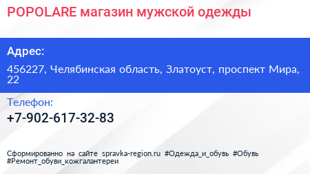POPOLARE, магазин мужской одежды по адресу 456227, Челябинская область, Златоуст, проспект Мира, 22 в дальнейшем Организация, размещена в следующих категориях: