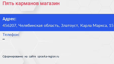 Пять карманов, магазин по адресу 456207, Челябинская область, Златоуст, Карла Маркса, 15 в дальнейшем Организация, размещена в следующих категориях: