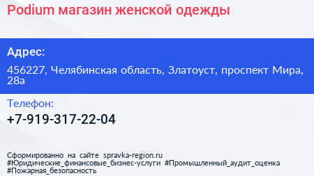Podium, магазин женской одежды по адресу 456227, Челябинская область, Златоуст, проспект Мира, 28а в дальнейшем Организация, размещена в следующих категориях: