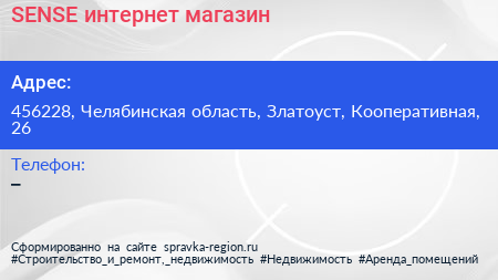 SENSE, интернет-магазин по адресу 456228, Челябинская область, Златоуст, Кооперативная, 26 в дальнейшем Организация, размещена в следующих категориях: