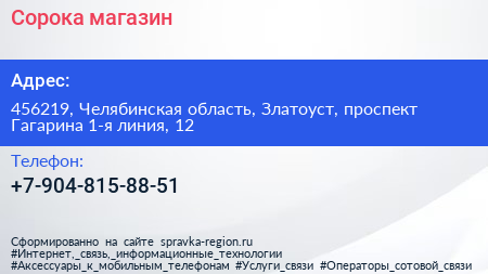 Сорока, магазин по адресу 456219, Челябинская область, Златоуст, проспект Гагарина 1-я линия, 12 в дальнейшем Организация, размещена в следующих категориях: