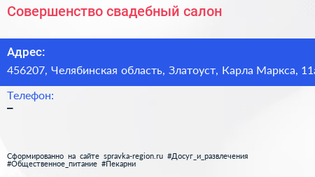 Совершенство, свадебный салон по адресу 456207, Челябинская область, Златоуст, Карла Маркса, 11а в дальнейшем Организация, размещена в следующих категориях: