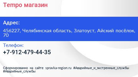 Tempo, магазин по адресу 456227, Челябинская область, Златоуст, Айский посёлок, 70 в дальнейшем Организация, размещена в следующих категориях: