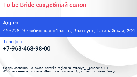 To be Bride, свадебный салон по адресу 456228, Челябинская область, Златоуст, Таганайская, 204 в дальнейшем Организация, размещена в следующих категориях: