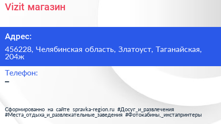 Vizit, магазин по адресу 456228, Челябинская область, Златоуст, Таганайская, 204ж в дальнейшем Организация, размещена в следующих категориях: