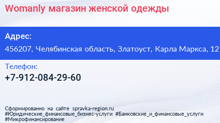 Womanly, магазин женской одежды по адресу 456207, Челябинская область, Златоуст, Карла Маркса, 12 в дальнейшем Организация, размещена в следующих категориях: