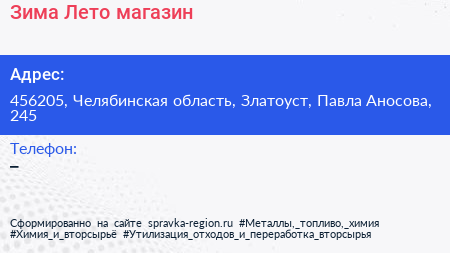Зима-Лето, магазин по адресу 456205, Челябинская область, Златоуст, Павла Аносова, 245 в дальнейшем Организация, размещена в следующих категориях: