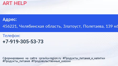 ART HELP по адресу 456221, Челябинская область, Златоуст, Полетаева, 139 к6 в дальнейшем Организация, размещена в следующих категориях: