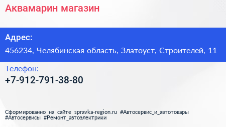 Аквамарин, магазин по адресу 456234, Челябинская область, Златоуст, Строителей, 11 в дальнейшем Организация, размещена в следующих категориях: