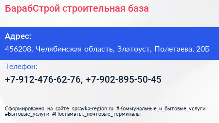 БарабСтрой, строительная база по адресу 456208, Челябинская область, Златоуст, Полетаева, 20Б в дальнейшем Организация, размещена в следующих категориях: