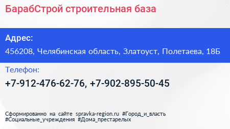 БарабСтрой, строительная база по адресу 456208, Челябинская область, Златоуст, Полетаева, 18Б в дальнейшем Организация, размещена в следующих категориях: