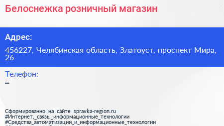 Белоснежка, розничный магазин по адресу 456227, Челябинская область, Златоуст, проспект Мира, 26 в дальнейшем Организация, размещена в следующих категориях: