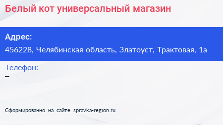 Белый кот, универсальный магазин по адресу 456228, Челябинская область, Златоуст, Трактовая, 1а в дальнейшем Организация, размещена в следующих категориях: