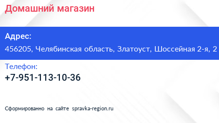 Домашний, магазин по адресу 456205, Челябинская область, Златоуст, Шоссейная 2-я, 2 в дальнейшем Организация, размещена в следующих категориях: