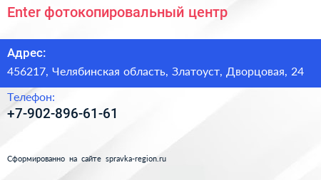 Enter, фотокопировальный центр по адресу 456217, Челябинская область, Златоуст, Дворцовая, 24 в дальнейшем Организация, размещена в следующих категориях: