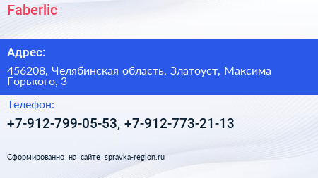 Faberlic по адресу 456208, Челябинская область, Златоуст, Максима Горького, 3 в дальнейшем Организация, размещена в следующих категориях: