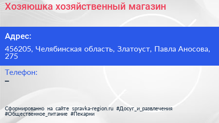 Хозяюшка, хозяйственный магазин по адресу 456205, Челябинская область, Златоуст, Павла Аносова, 275 в дальнейшем Организация, размещена в следующих категориях: