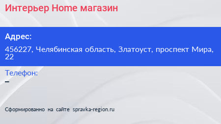 Интерьер Home, магазин по адресу 456227, Челябинская область, Златоуст, проспект Мира, 22 в дальнейшем Организация, размещена в следующих категориях: