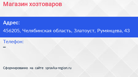 Магазин хозтоваров по адресу 456205, Челябинская область, Златоуст, Румянцева, 43 в дальнейшем Организация, размещена в следующих категориях: