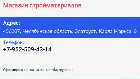 Магазин стройматериалов по адресу 456207, Челябинская область, Златоуст, Карла Маркса, 6 в дальнейшем Организация, размещена в следующих категориях: