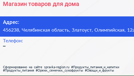 Магазин товаров для дома по адресу 456238, Челябинская область, Златоуст, Олимпийская, 12а в дальнейшем Организация, размещена в следующих категориях: