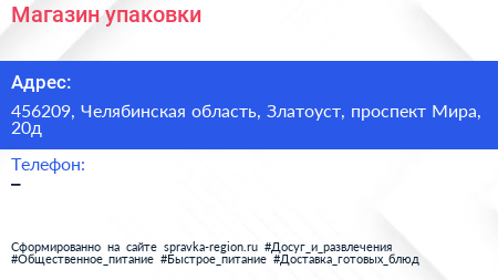 Магазин упаковки по адресу 456209, Челябинская область, Златоуст, проспект Мира, 20д в дальнейшем Организация, размещена в следующих категориях: