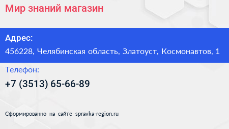 Мир знаний, магазин по адресу 456228, Челябинская область, Златоуст, Космонавтов, 1 в дальнейшем Организация, размещена в следующих категориях: