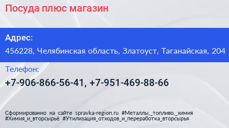 Посуда плюс, магазин по адресу 456228, Челябинская область, Златоуст, Таганайская, 204 в дальнейшем Организация, размещена в следующих категориях: