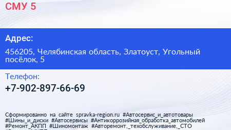 СМУ-5 по адресу 456205, Челябинская область, Златоуст, Угольный посёлок, 5 в дальнейшем Организация, размещена в следующих категориях: